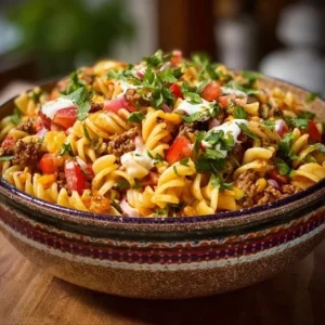 A quick and easy Taco Pasta Salad that combines the comfort of pasta with bold taco flavors, perfect for busy weeknights and satisfying for the whole family.