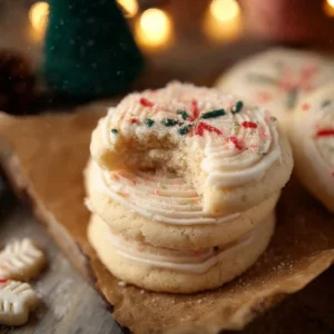 - Pipe or spread the frosting onto the cooled cookies, sprinkling additional Christmas sprinkles just before serving.