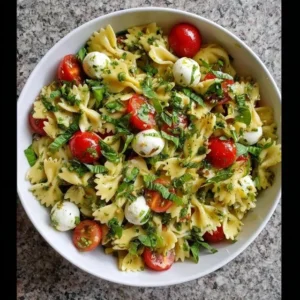 A vibrant and fresh pasta salad with bow tie pasta, colorful vegetables, and feta cheese, perfect for picnics, lunches, or as a side dish.