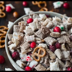 A festive and fun treat mixing Chex mix, popcorn, pretzels, and peanuts, all coated in sweet white chocolate and decorated with Christmas sprinkles.